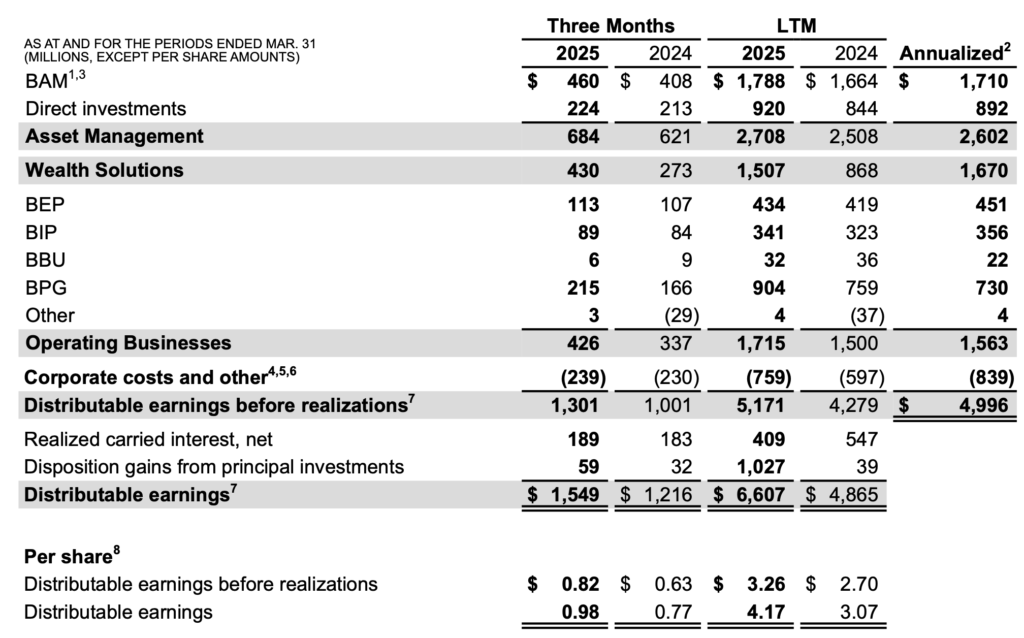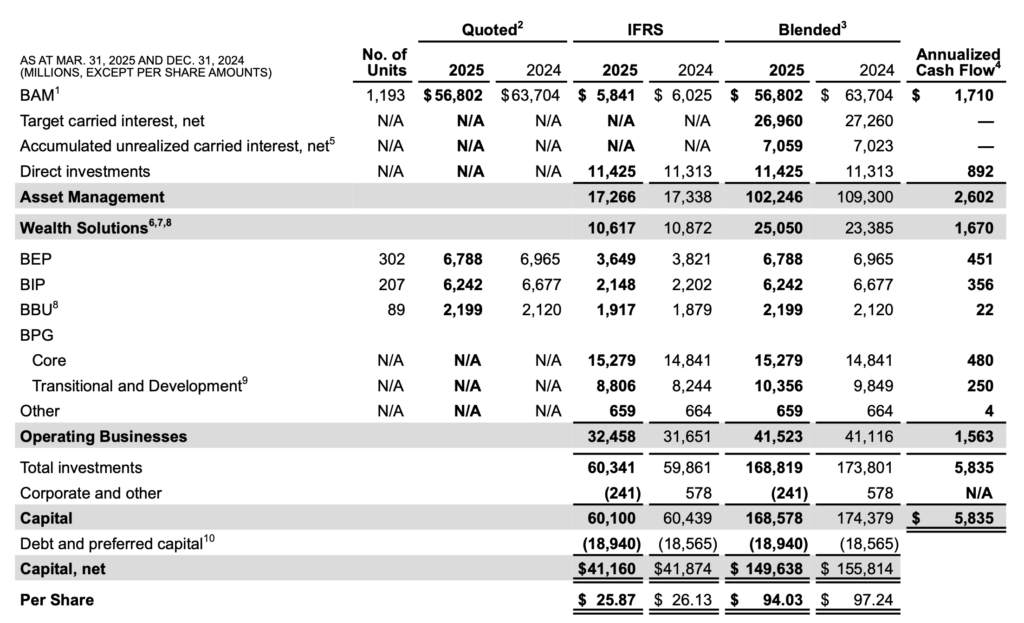 - Capital Allocation: Over the LTM, BN allocated $8.532 billion to its businesses, including $2.539 billion to Asset Management (e.g., real estate and credit funds), $2.461 billion to Wealth Solutions, and $1.955 billion to Operating Businesses, primarily for debt repayment and real estate investments (page 8). BN returned $1.577 billion to shareholders via $509 million in dividends and $1.068 billion in share repurchases (21.7 million shares), with $569 million in Q1 (10.4 million shares). The press release notes $850 million in 2025 YTD repurchases, adding over 40 cents per share in value.