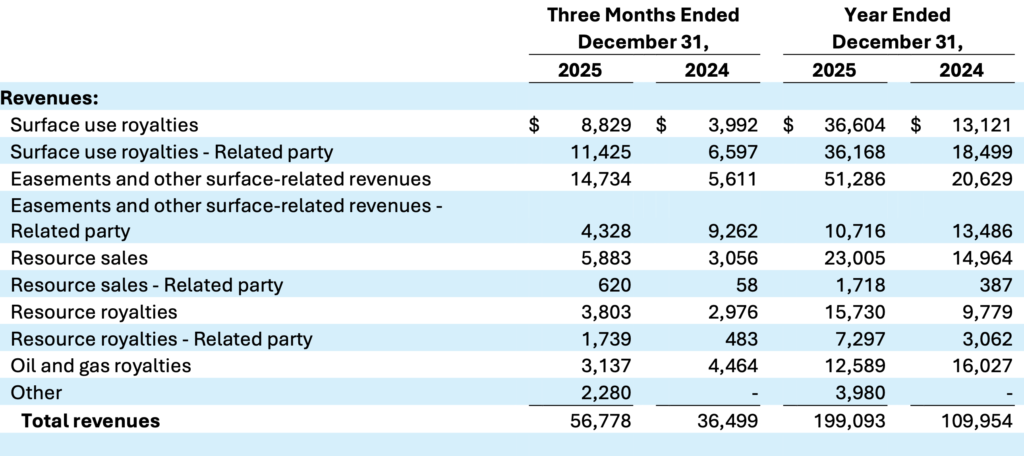 LandBridge’s fourth-quarter results are a testament to the structural advantages of a royalty and surface-fee model. The company reported total revenues of US $56.8 million for Q4 2025, representing a 12 percent sequential increase from Q3 and a massive 56 percent jump year-over-year. For the full year 2025, revenues reached US $199.1 million, an 81 percent surge compared to 2024.