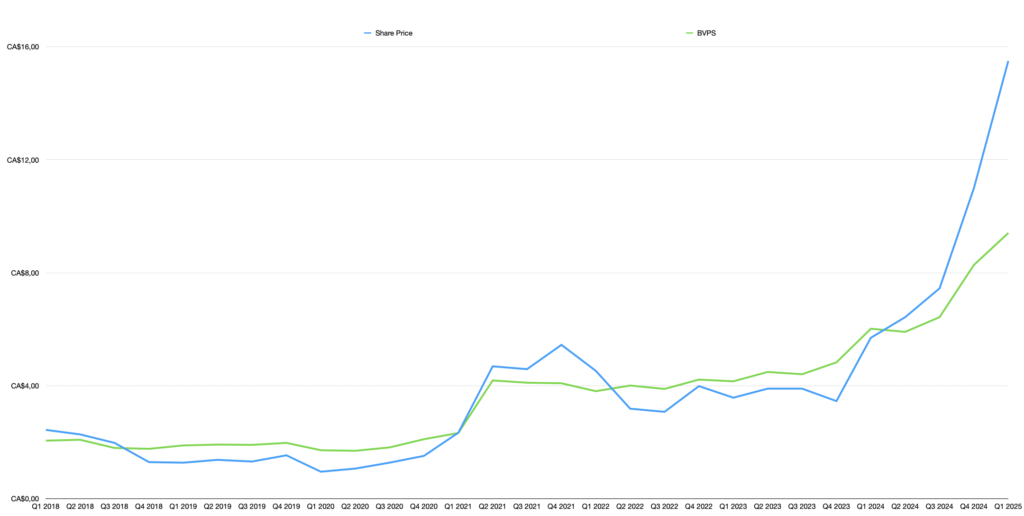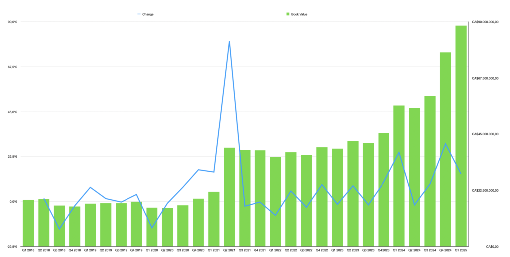 Pinetree’s portfolio has evolved significantly since 2018. Starting with a C$16 million portfolio, it grew to C$20 million in 2020 through early VMS gains, C$39 million in 2021 post-rights offering, C$45 million in 2023 after strategic exits and activist successes and C$88 million in Q1 of 2025. From 2018 to 2025 Pinetree’s book value had a CAGR of 56%, driven by a major acceleration starting in 2023. The 2021 rights offering, priced at C$1.85 per share (a 26% discount to VWAP), doubled investment capacity, with insiders like L6 Holdings, Tolnai, and Okhai maintaining 45% ownership. A 2022 share consolidation (100:1) and split (1:50) streamlined the shareholder base, reducing small investors and assigning a new CUSIP to avoid tax complications.