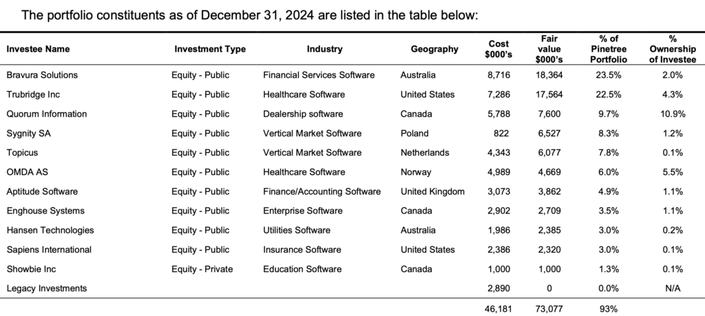 Pinetree’s portfolio, as of December 31, 2023, comprises a concentrated selection of high-growth software and technology companies, with the April 2025 press release emphasizing their role in driving value through active portfolio management.