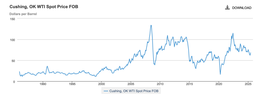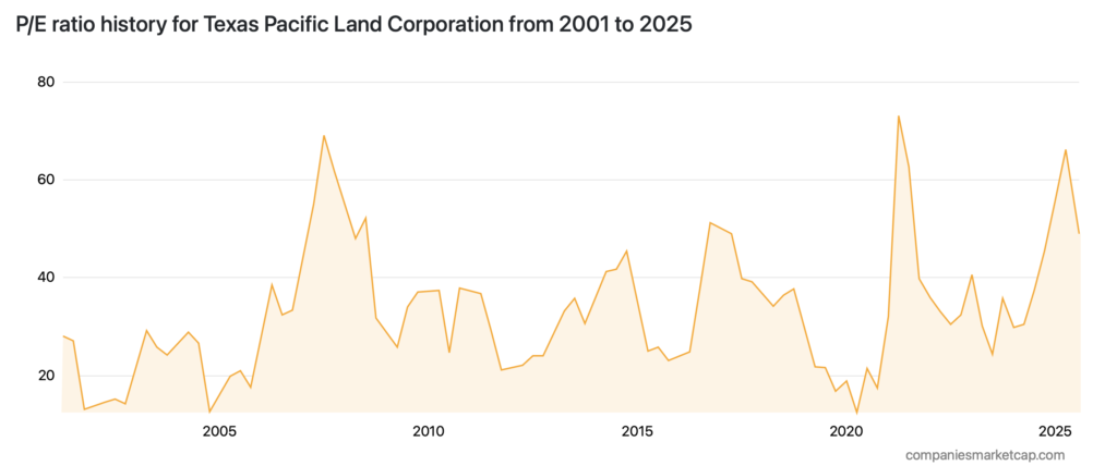 - Cyclical Patterns: The P/E ratio’s fluctuations correlate with oil price cycles, as TPL’s revenue was historically dominated by oil and gas royalties. Low P/E ratios (e.g., 13 in 2001 or 25-12.4 in 2019-2020) coincided with low oil prices, while peaks (e.g., 69 in 2007 or 73 in 2021) reflected highs. The 2024 P/E of 55.94 is within historical ranges and aligns with expectations of growth from water royalties and a general improvement of the business. The report’s claim of a “divergence” ignores this context, assuming a static P/E norm.