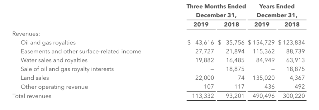 - Strategic Diversification: From 2019 to 2024, TPL has further diversified into water sales, royalties, and servicing, reducing reliance on oil and gas royalties. The 2024 10-K shows a combined $254.8M in water-related revenues, up 200% from $84.9M in 2019. Oil and gas revenues grew from $154.7M in 2019 to $373,3M in 2024, an increase of about 150%. This shift towards water-related revenues (more under „2. Water Infrastructure and Data Center Opportunities“) supports a higher P/E, as these revenue are less cyclical, making the business more consistent.